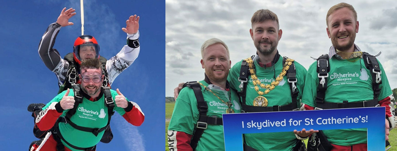 The intrepid duo accepted a challenge to leap from 11,000 feet in a tandem skydive in aid of St Catherine’s Hospice at the Black Knights Parachute Centre at Cockerham near Lancaster. They were joined by Paul’s husband and Mayoral Consort, Chris, who bravely completed the jump alongside them. Between them, the trio has already raised over £5,000 for St Catherine’s Hospice, which provides vital palliative and end-of-life care to patients and families across Lancashire.