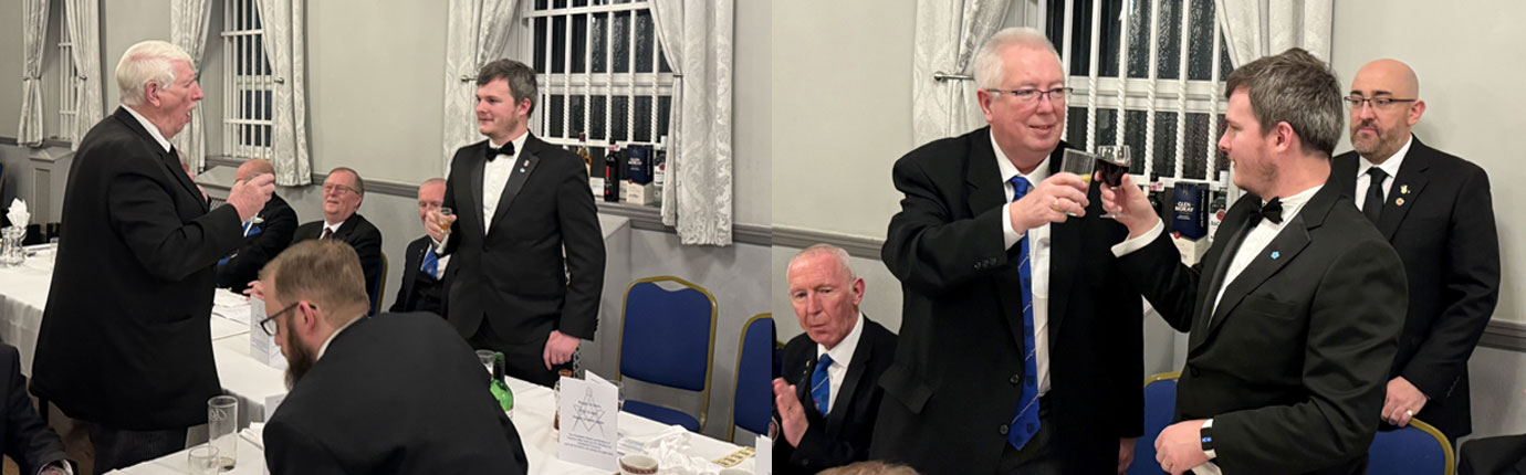 As the lodge concluded its meeting and the WM invited everyone to join him at the festive board. This event was a celebration, as John sat proudly beside his son at the top table. During the evening, Norman Pritchard delivered an enthusiastic rendition of the Master’s Song, showcasing his own unique style.